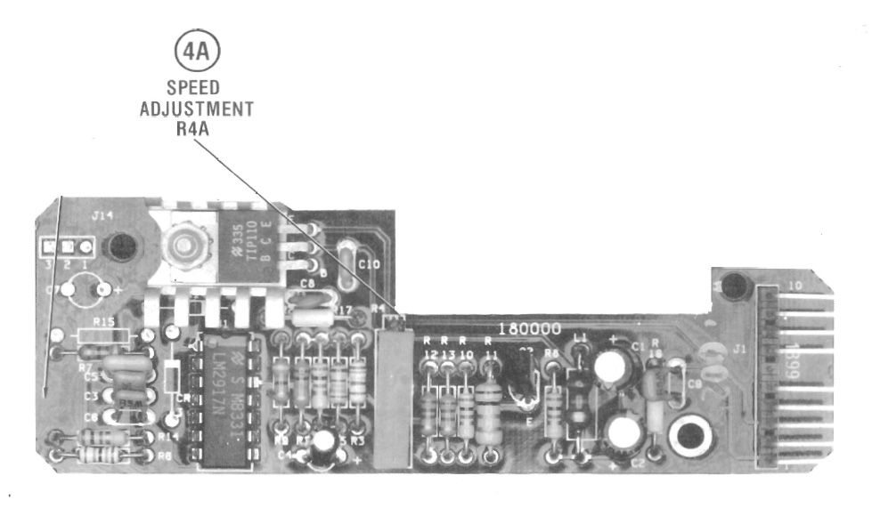 To adjust spindle speed, use a screwdriver to adjust R4 (photo) on the servo board, the board located on the rear of the drive.