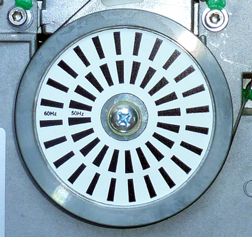 Underneath the drive, you will see the spindle's flywheel (photo). On it are two sets of ring patterns, one labelled '50Hz' and the other labelled '60Hz'. The one you are to use corresponds the frequency of mains electricity (house electricity) used in your country. Position the drive so that the flywheel is exposed to strong (repeat: strong) fluorescent light (repeat: fluorescent). Now, insert a floppy, then perform an operation that results in the spindle (and thus the flywheel) turning. The pattern that corresponds to your country's mains electricity frequency should not move. Well, there is going to be a little bit of movement, but it should not be much.