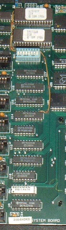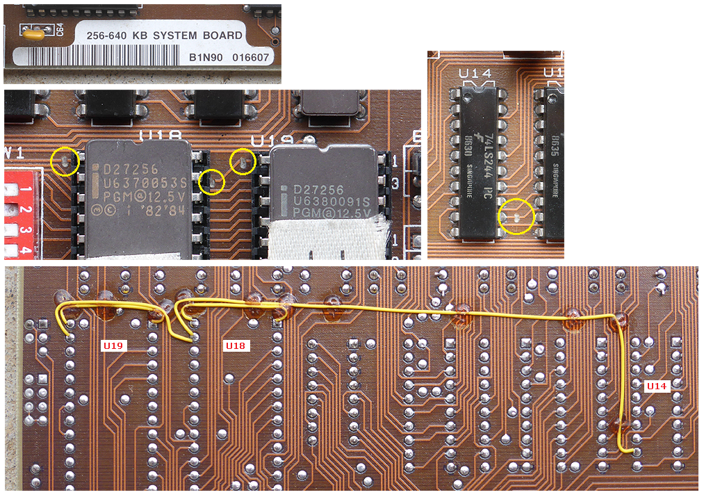 The photos at here show the rewiring of the U18/U19 sockets on a 256-640KB labelled motherboard that I have, this motherboard being one that I believe IBM upgraded from a 64-256KB one.  Another one is shown at here, excepting the mod is all done on the component side of the PCB.