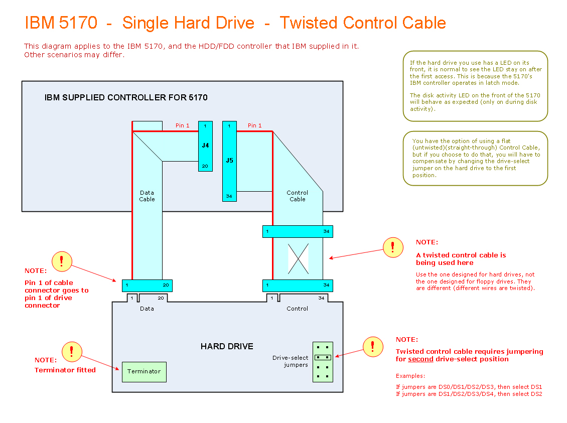 • You need to use the particular cable shown at here. The IBM controller expects it. The cable manipulates both the motor-on and drive-select lines.