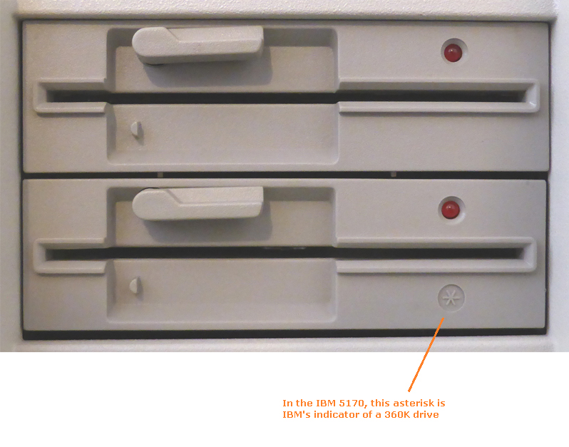 | • | If your IBM 5170 has the optional second floppy drive: - Be aware that for the 5170, IBM marked 360K drives by placing an asterisk on the front of the drive. (Photo) - The 5170's power-on self test (POST) will not boot from the second floppy drive (B:). |