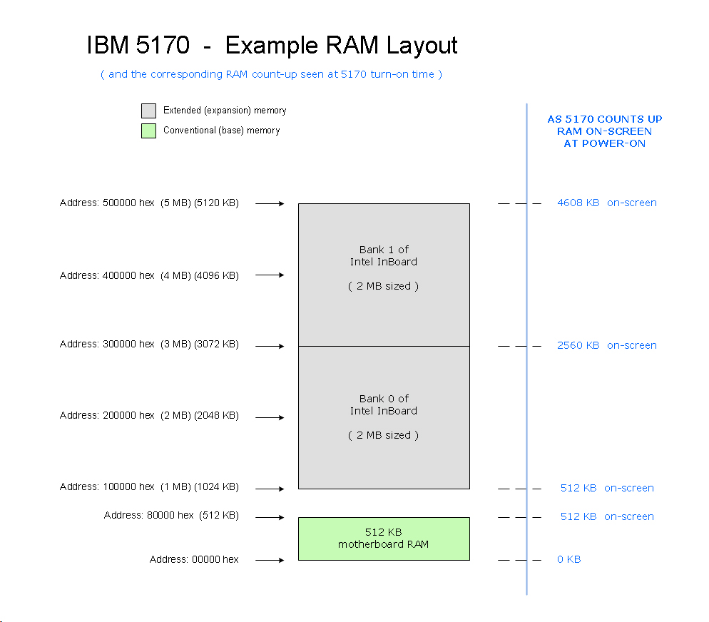 | • | The RAM test, and on-screen count, done by the motherboard's power-on self test (POST): 1. excludes the gap between conventional (base) memory and extended (expansion) memory; and 2. excludes any expanded memory. An example of the on-screen RAM count is shown at here. |