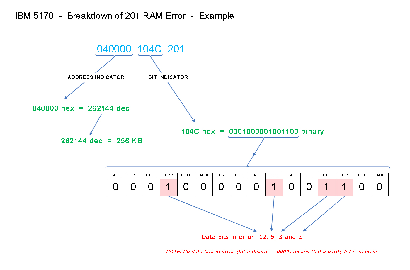 If your 5170 suffers a failure within the first 64K of any chip in the motherboard's first bank of RAM (bank 0), the resulting symptom depends on the type of video card/monitor fitted. If MDA or CGA, you will see a '000000 xxxx 201' error on-screen, where the xxxx value indicates the bit (or bits) that have failed. If instead, EGA or VGA is fitted, you will have what appears to be a 'dead' motherboard.