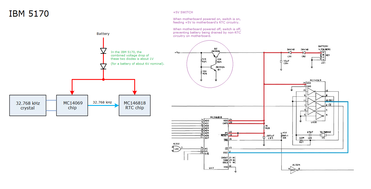 On the 5170 motherboard, the real time clock (RTC) circuitry is essentially two blocks: an RTC chip and an oscillator that feeds (ticks) the RTC chip.