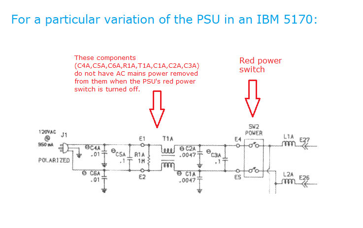 Turning off the power supply's big red switch does not remove AC mains (house) voltage from all components within the power supply.  (Example)