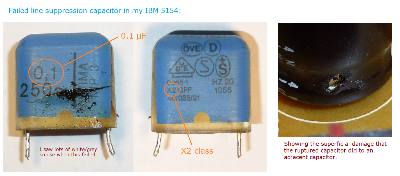 For RIFA made capacitors like this one, the rupture is accompanied by smoke and a strong foul odour. The odour will persist until the capacitor is removed. The capacitor contains fluid, which may leak out. Do not touch the fluid (it may be carcinogenic, or otherwise toxic). The "X" in "0,1µF@X" probably indicates that this capacitor is of class X (expected because it sits between line and neutral). |