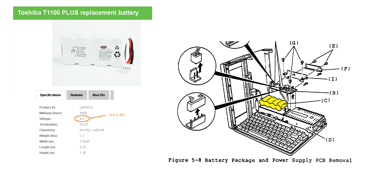 The T1100 PLUS maintenance manual indicates that the 5.25" external floppy disk drive contains a NiCd (Ni-Cd)(Ni-Cad) battery.