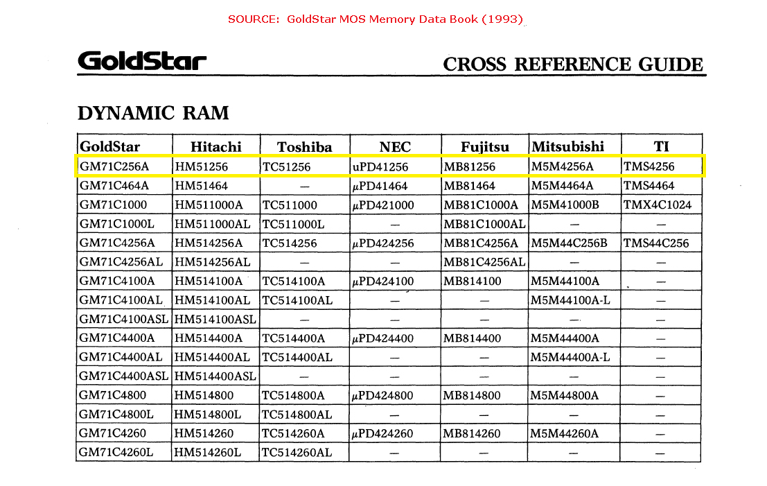 | GoldStar | GM71C256A-10 | 100 ns | CMOS | 256cycle/4ms | 41256 list 4 | 41256 list 5 | datasheet | Datasheet contains "All inputs and output TTL compatible" | |||
