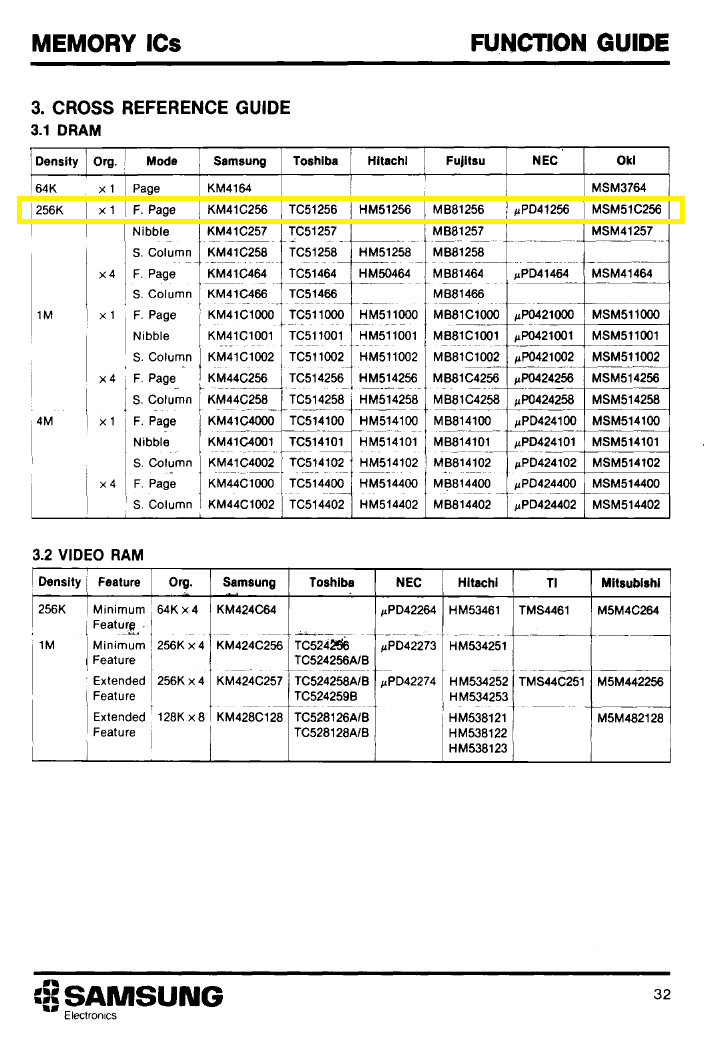 | Samsung | KM41256-10 | 100 ns | NMOS | 256cycle/4ms | 41256 list 3 | 41256 list 4 | |||||