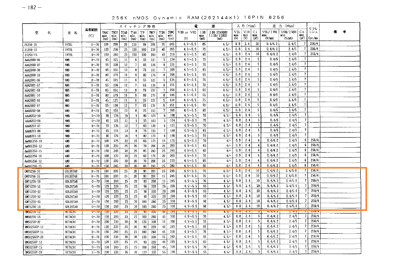 | Fujitsu | MB81256-80 | 80 ns | NMOS | 256cycle/4ms | 41256 list 3 | 41256 list 4 | 41256 list 5 | ||||