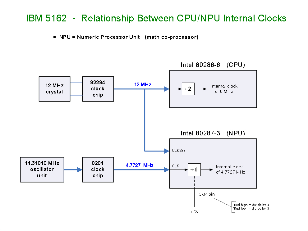 In the 8 MHz version of the IBM 5170, any 80287 fitted needs to be rated at 6 MHz, or faster (because the motherboard runs the 80287 at 5.33 MHz.)  [diagram]