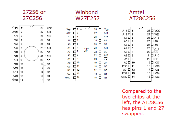 WARNING:  The Amtel AT28C256 is NOT a 27C256 equivalent.