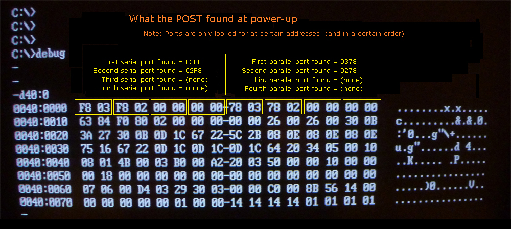 For example, a serial port that resides at addresses 3F8 hex to 3FF hex, is simply referred to as a serial port at 3F8.