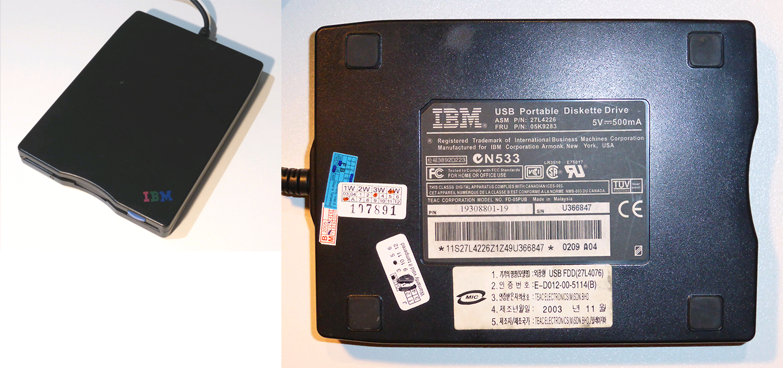 IBM part number 27L4226 Teac FD-05PUB 2003 Windows 10 shows "TEAC FD-05PUB USB Device".  "FD-05PUB" also appears on underside label.  See note 1.