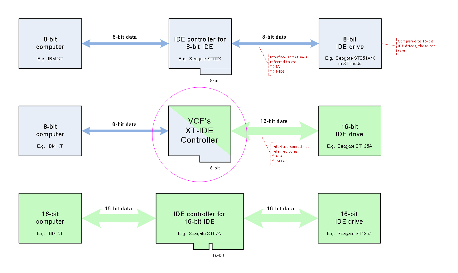 Members of the VCF decided to take advantage of the large nubers of 16-bit IDE drives (AT type of IDE) that exist (including CF cards and DOMs).  They designed a card, named the XT-IDE, which interfaces 16-bit IDE drives to the 8-bit expansion bus of the IBM XT.  Click here to see a diagram.   (Similar cards had already existed, an example being JDR's MCT-IDE-8.)