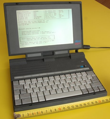 The ABC Bicom SL60 is actually an upgraded version of the B240i/B260i, just with a 386 processor instead. Unfortunately they left out the PCMCIA slot and they still didn't upgrade the display or graphics card. Thus it is pretty disappointing compared to the previous models. Battery life is probably the worst of any device in this list. The 386 and the HDD burn through batteries like there's no tomorrow.I had popped in 5 brand new Panasonic batteries (No china crap) and just wanted to backup the HDD via serial. Yeah i understand that the serial port and HDD use loads of energy, but no kidding - the "low battery" lamp and beep got on like after 15 minutes. The laptop died down from lack of power before i was finished backing up everything. Go figure... This could have been a pretty cool device - 386, full size ports, 5 batteries... With good power management and PCMCIA this would have been a good companion. As it is you will hate it for being forced to serial data transfers and bringing a suitecase full of AA-Batteries. HP showed with the Omnibook 430 that a 486 with much better VGA display can run much longer on just 4 AA-batteries. A Floppy disk drive was an optional accessory and it occupied both - the parallel and floppy port - when connected.