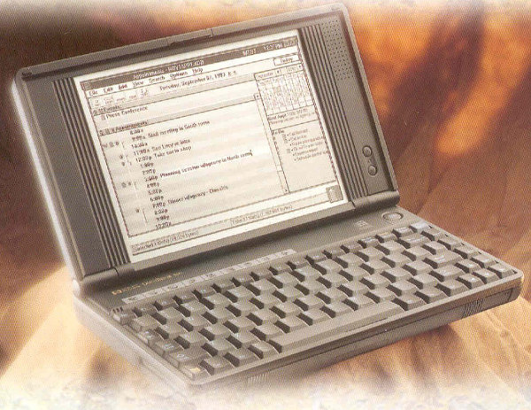 The Hewlett Packard Omnibook 425 is the successor to the Omnibook 300 and features a faster 486 processor and updated software. Besides that it is the same size and weight as the OB300 and basically also has the same features. It has the same look and design as the HP 200LX (Or 100LX / 95LX if you want) albeit much larger of course. Still it is small enough to be called a subnotebook. The reason why i include the Omnibook series here is not the size (They are really too large to be considered a palmtop, no matter how optimistic you are), but mostly the fact that you can run it from AA-Batteries. However, they kept some neat features from the LX series that make the Omnibook much different from a "normal" laptop. At first all the Software (Operating System and appz) is kept in a ROM, just as you know it from all palmtops. And it also features the neat "Instant on" feature like the palmtops. However - there are a few differences. The OB425 runs MS-DOS with Windows 3.1 - so unlike a palmtop which always came with DOS and some PIM software you also get a full windows. Also the Operating system is not completely loaded directly from the ROM but is intended to be installed to a PCMCIA drive. Options here were a "Type 3" PCMCIA Harddisk (Covering 2 slots) or the neat but smaller and more expensive "SSD" which was just a PCMCIA Flash card. So if you boot from the ROM it will just look for PCMCIA storage cards and prompt you to install Windows and the rest there (If it's not installed already). The "normal" boot would occur from your PCMCIA storage, load MS-DOS and fire up Windows 3.1. The Installation includes a small office package, so you also get WinWord and Excel. The Omnibook series comes with a neat "pop-out" mouse which will really pop out of the case if you psuh the button. It is truly unique as it is a mouse on some kind of stick that you can even use hovering in the air since the stick that connects mouse and notebook translates your movement. The screen is a neat full VGA monochrome screen which unfortunately does not have a backlight option. I know backlight is a waste of energy but as an option so you could turn it on if needed would have been nice. A big caveat (That was fixed for the OB430) is the ROM which annoyingly checks if you are running the "correct" installation and will not let you install other OS like Windows 95, Linux or such. There is a "hidden" extension slot on the side - the only accessory that was ever made for this slot was an analog modem. The only difference between the OB430 is the ROM card, so if you swap the ROM card with one from a 430 model you effectively have an OB430. The ROM card is also a PCMCIA card. Note that you can NOT boot the computer without any ROM card, so one of the 4 PCMCIA slots is always "lost" due to the ROM.