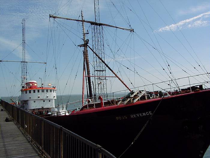 Radio Caroline´s ship the MV Ross Revenge crossed the Thames Estuary on June 21st 1999, and was currently (9/99) still moored at the end of the pier. The background to this move is covered by this site. She is now moored in the Medway estuary, as can be seen here.