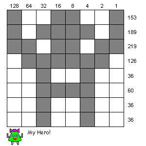 By redefining these numbers, we can alter which bits are set in which rows and hence draw our own characters. We could make our very own alien like this: