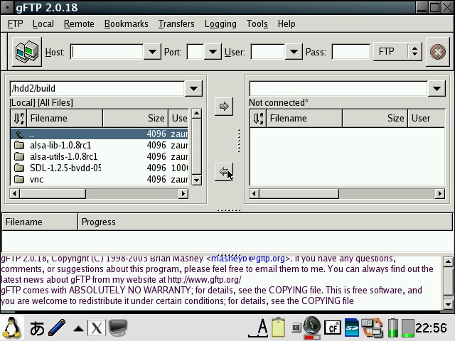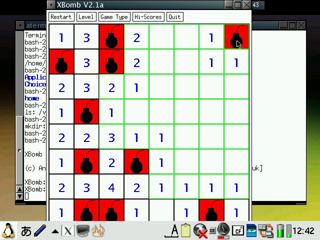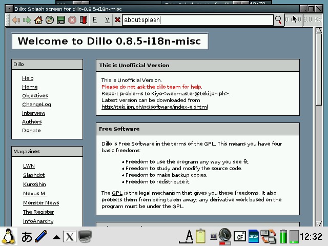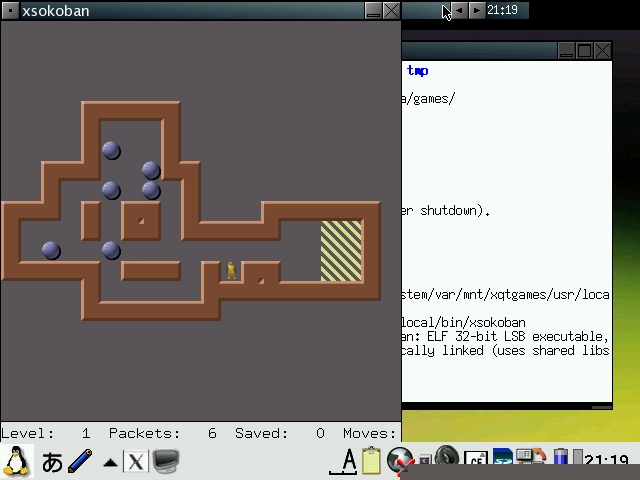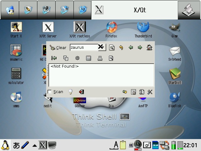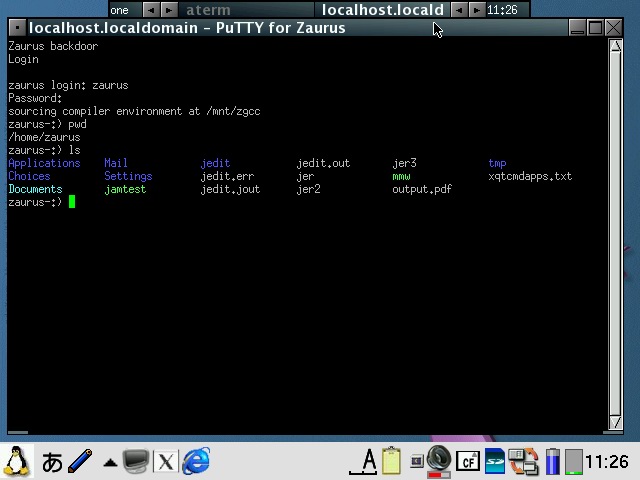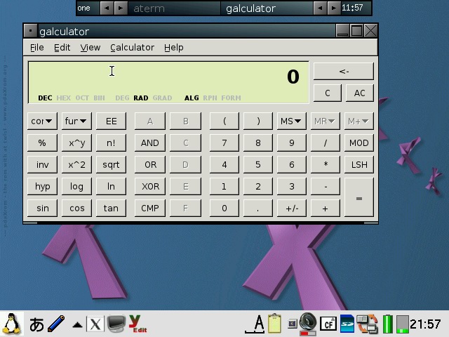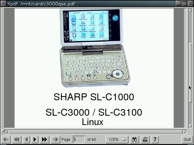 Abiword has been configured to start in 640x480 or 480x640 mode depending on the model and display English even on Zauri with Japanese locales. Abiword uses the system locale to determine what language to display menus in, ie English menu with en locale, Japanese with ja locale. However, since many clamshell models on Sharp ROM use the ja locale with the menus converted to English, the same was required for AbiWord. The file /etc/X11/app-defaults/Abiword.strings contains the text for the menus and is a copy of en-GB.strings for English menus. If you want your menus in another language, then simply replace it with the language file of your choosing. I also compiled aspell and included a dictionary so you also get an English spell checker. Additionally, I also compiled a few plugins for abiword, mainly text converters so you can open additional document types such as OpenOffice, MSWrite and PDF files. I also got printing to a PDF file working partially. Currently it only works with certain fonts, so if the results looks like garbage, try again with another font. Firefox has been enhanced a bit. It originally had a small problem with its own launch script but now it launches itself into a new tab if you launch firefox multiple times when it has already been started. I have also compiled the gplflash plugin so flash animations can be viewed with firefox. A java plugin is also available, but it requires jamvm and classpath (available on the java image) and perl (available on the zgcc image). GQView, xpdf, grisbi, putty and abiword have been recompiled to force them to stick to the 640x480 screen size and not go beyond. Also, most applications have been customised to start in full screen but not covering the bottom menu bar. This has been done for both portrait as well as landscape based models and is managed by FluxBox. I also hacked GTK2 to restrict the window size to 640x480 and 480x640, so hopefully all applications will fit onto the screen. I have tested AbiWord and FireFox and all dialog boxes I could find were correctly sized. However, if there are any oversized windows, then use Alt+n to maximise the window or Alt+arrow keys to move them around. I purposely hacked GTK2 instead of the window manager (fluxbox) which is where it should be fixed. However, since X/Qt can run in rootless mode without a window manager, the window size needs to be controlled higher up in GTK2. A rotate feature which resizes the windows of running applications has also been added and is accessible from the FluxBox menu. StarDict has not been configured with any default dictionaries. You will need to install your own dictionaries into /usr/local/share/stardict/dic. Alternatively, I have created a huge squashfs image with many stardict and qbedic dictionaries as well as the stardict sound files for pronouncing the words in English. You can use that image (dictionaries.squashfs) as well but you will need more than 300MB of space for it. xmms has been hacked to allow it to use more Zauri friendly keys. You can now use the OK and Cancel keys as Play and Stop. Also Up and Down have been reassigned to change tracks and N and M are now used for volume control. The goal was to be able to use the sidekeys on the back of the Zaurus to control xmms just like the MusicPlayer when the display is closed or you are using it in PDA mode (portrait) without access to the keyboard. xmms can play wav, mp3 and mod files and I have also compiled mplayer 1.1pre8 with X11 support so xmms can launch mplayer inside a little gtk window for watching short clips. I have also compiled the mplayer GUI - gmplayer. Note that this version of mplayer runs via X/Qt which runs via a frame buffer through QT/E so it will never be as fast as mplayer running via bvdd or ati. However, mplayer is compiled with XScale CPU optimisation so it does perform reasonably for small clips and it supports more codecs than the older version. A hacked version of DOSBox is also included. The : key has been hacked to work in this version. Fn + ; will give the : key. Fn + Ctrl + ; will give the ; key. To exit dosbox just type exit. In addition, the following tools are available via the command line in pdaXqtrom: pdf tools