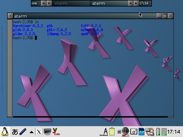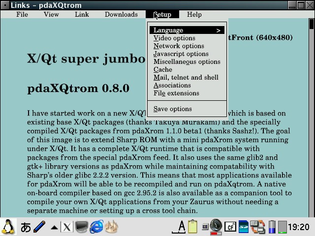 Best viewed on NetFront (640x480) X/Qt super jumbopdaXQtrom 0.8.2The new X/QT super jumbo package is the next generation of X/Qt and is based on existing base X/Qt packages (thanks Takuya Murakami) and the specially compiled X/Qt packages from pdaXrom 1.1.0 beta1 (thanks Sashz!). The goal of this image is to extend Sharp ROM with a mini pdaXrom system running under X/Qt. It has a complete X/Qt runtime that is compatible with packages from the special pdaXrom feed. It also uses the same glib2 and gtk+ library versions as pdaXrom while maintaining compatability with Sharp's older glibc 2.2.2 version. This means that most applications available for pdaXrom will be able to be recompiled and run on pdaXqtrom. A native on-board compiler based on gcc 2.95.3 is also available as a companion tool to compile your own X/Qt applications from your Zaurus without needing a separate machine or setting up a cross tool chain. A java runtime and development environment is also available as an optional add-on as well. However, since pdaXqtrom extends Sharp ROM, and many of its libraries are compiled for compatability rather than speed, it is rather slow in comparison to pdaXrom which is optimised for speed. pdaXqtrom is also limited to the constraints of the old version of Qtopia that Sharp ROM is based on as well as the X/Qt libraries which were not compiled with xscale optimisations. This means that you will be lucky just to get half the speed of pdaXrom since pdaXrom is quite optimised for each class of models, so if speed is what you want, then consider using pdaXrom instead. pdaXqtrom can be optimized a bit more but will never be as fast as pdaXrom since pdaXrom uses the faster soft float instead of the slower hard float which Sharp ROM is using. pdaXqtrom should also work on Cacko since it is a derivative of Sharp ROM. It should work on all clamshell models as well as Tosa. 5x00 models would struggle because of the limited memory and smaller screen size but should work too in a limited fashion (the previous X/Qt jumbo package would be a better choice for 5x00 models since it requires less resources). It is recommended to use a swap file of at least 64MB with pdaXqtrom. You can either manually create and enable a swap file/partition yourself, or use the qtopia-memoryapplet to do it. Cacko already includes a memoryapplet for creating swap files. I have packaged an improved version [qtopia-memoryapplet_1.0.4_arm.ipk] which allows C3x00 models to create the swapfile onto the internal MicroDrive on /hdd3 and also the creation of swapfiles up to 512MB. The pdaXqtrom base image is available as a mountable cramfs and/or squashfs image, as well as a gzipped tarball which can be extracted to an ext2/ext3 filesystem. The default window manager for pdaXqtrom is fluxbox. Alternate window managers can be used also such as icewm. The file /etc/X11/defaultwm specifies which window manager is loaded when X/Qt is started. X/Qt running fluxbox with custom BluePDA theme
