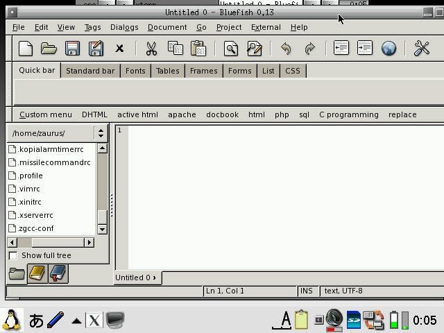 You can also customise the theme and styles. FluxBox comes with a set of styles located under /opt/QtPalmtop/share/fluxbox/styles. I have created one called BluePDA which is used by default. You switch styles easily from the FluxBox menu under the FluxBox Config options. To customise a style, copy it to /home/zaurus/.fluxbox/styles and edit away. The background image is part of the style, so in order to change the wallpaper, you will need to edit the style unless you are using the default BluePDA style. Its wallpaper is a symbolic link to /opt/QtPalmtop/share/backgrounds/wallpaper.jpg and you can just replace it with any jpg file. There is also a GTK+ theme selector to switch GTK+/GTK2 themes and styles. I have added a few themes and they are located under /opt/QtPalmtop/share/themes. You can copy additional themes to that location. You can customise FluxBox, its menu and shortcut keys using the FluxBox config tools.