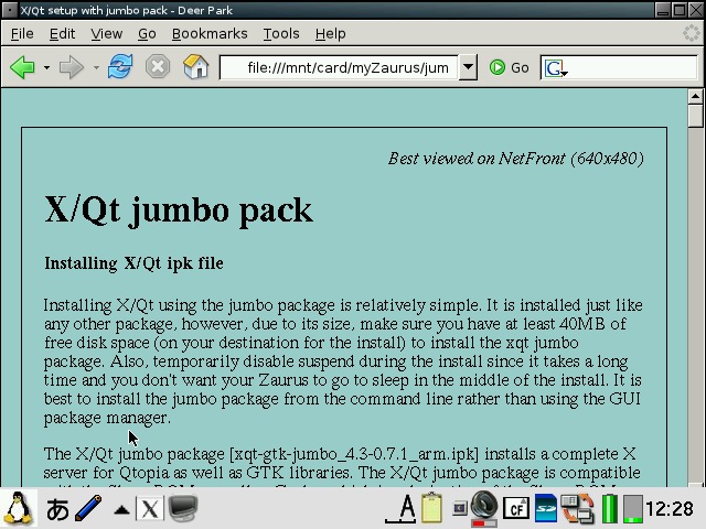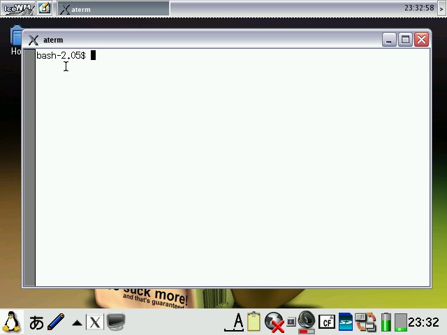 A second image, pdaXqtrom apps, is also provided as an add-on with the applications listed below pre-installed and configured. The pdaXqtrom base and application images are available from the following location: pdaXqtrom images In addition, there also are a few special feeds for all the tested applications. The base and apps images are build from these feeds. The base image can be used with the pre-configured application image, or individual applications can be separately installed from the apps feed using the default Sharp installer. The pdaXQtrom compressed images can be installed to anywhere you like. Basically, put them where ever you have the space for it. There are three different formats to choose from: cram, squash and tgz. The cramfs compressed images will work for everyone. In order to use the squashfs images, you will need to install a squashfs kernel module first. The advantage of squashfs over cramfs is that it has better compression and thus is smaller. The last option is a compressed tarball. If you don't want to use compressed loop back images but want to extract the files, then you can use the tgz files. However, make sure the destination for the install is an ext2 or ext3 formatted filesystem if you use the tgz file. For the cramfs/squashfs images, the filesystem type does not matter. To install, copy the files you want to install and the install script (inside pdaXqtrom-install.zip) to the destination location. Make sure they are all in the same directory and then do the following: