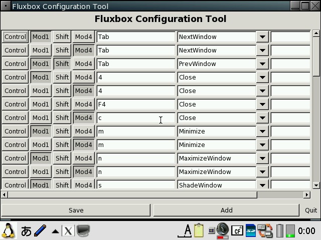 Use this script to generate a QT desktop icon for an X application if it does not have one. It will generate a launch script and desktop files under the XQt tab. If you want to install applications directly from a pdaXrom feed, you need to update your package list and have all the packages that come with pdaXqtrom-base listed there. This script will generate the required info and populate the package list with it. This script can be used to enable or disable scim (Smart Common Input Method) which allows you to input other languages such as Chinese and Japanese. With scim disabled, ie monolingual enabled, X/Qt will startup faster. It is recommended if you only want to use English to enable monolingual mode. However, in order to input other languages in applications that support it, scim needs to be enabled. This can be done by disabling monolingual before starting X/Qt. This script can be used to toggle the default behaviour of the Qt desktop icons. You can use it to enable or disable the xembed mode. When xembed is enabled, all the desktop icons under the X/Qt tab will launch the applications in embedded/rootless mode which means they run in a lightweight mode under X/Qt without utilising all the features of X and the application appears to be running inside Qtopia. If you disable xembed, then the desktop icons will automatically start the full X/Qt environment and run from within the full X/Qt environment. This script is for SL-C3000 users only. Since X applications place their config files under the user's home directory, ie /home/zaurus and the SL-C3000 only has 4MB on /home, it will get filled up pretty quickly. Run the zhomefixC3000 after you run each X application for the first time. The script will attempt to move the config files to /hdd2/zaurushome and symlink it back. This script usually is not required and should not be run. It is a brute force approach to remove existing X/Qt files. Only use this script if you had a broken X/Qt installation previously that you could not cleanly uninstall or you get other errors. This script may be needed to be run by Cacko users if they get glib errors. If everything works, then don't run this script. X/Qt has its own set of basic key controls. The menu key is hardcoded to activate the X/Qt control which allows you to activate fullscreen mode or shutdown X/Qt. Fn+m shuts down X/Qt immediately. Also Fn+tap is equivalent to right mouse click whereas a single tap with the stylus is a left mouse click. Sometimes, when switching between X/Qt and QTopia, the caps lock is turned on under X/Qt. Just hit Shift several times to disable it. The rest of the keys is controlled by the keymapping file located under /etc/X11/kb/xmodmaprc. This file is loaded each time X/Qt starts up. During installation, an appropriate mapping file has been copied there depending on your Zaurus model. If you want to customise it, then copy it to /home/zaurus/.xmodmaprc and edit that copy in your home directory. You can use the xev command to determine the keycode for each key. If you have a Cxx00 model, ie one with 2.4.20 kernel, and you are using my custom keyhelper.xml, then you might also want to use my custom xmodmaprc file as well instead of the standard xmodmaprc. To use my custom xmodmaprc copy /mnt/pdaxqtrom-base/config/settings/xmodmap/xmodmaprc-custom to /home/zaurus/.xmodmaprc In addition, FluxBox also has some extra key shortcuts defined in /home/zaurus/.fluxbox/keys. Most of those shortcuts are defined to use the Mod4 (assigned to Super_L) and Mod1 (assigned to Alt_L) modifier keys which I mapped to the Home and Alt (left kanji) key respectively. FluxBox menu is activated by holding the Fn key and tapping on the desktop. To release/cancel from the menu, tap anywhere on the desktop (but not on any window/application on the desktop). You might also need to press the Cancel key as well. Here are the key shortcuts for FluxBox: