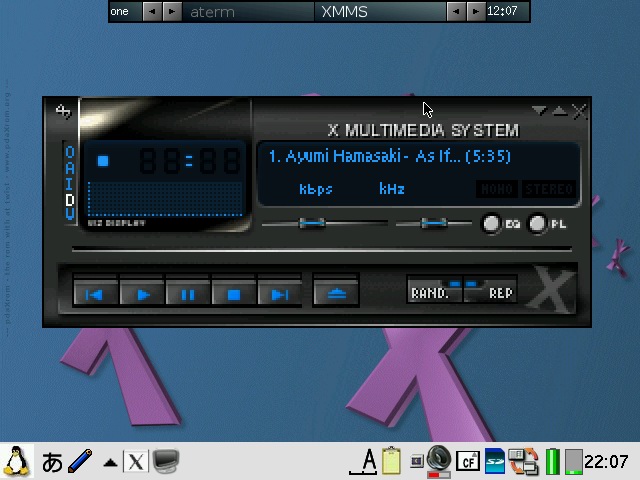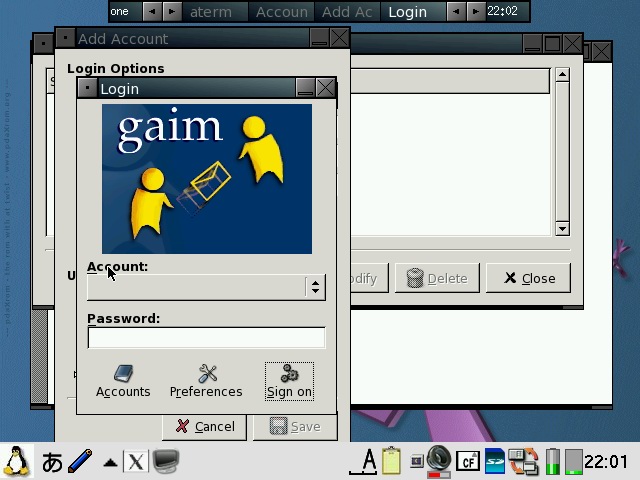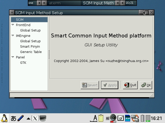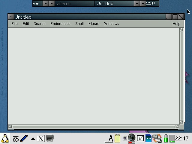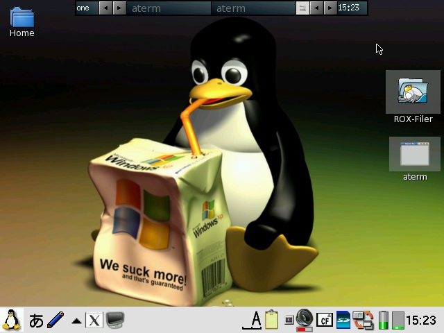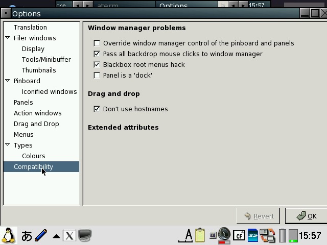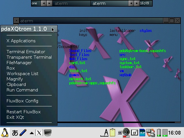 You will need to check both "Pass all backdrop mouse clicks to window manager" and "Blackbox root menus hack" in order to get the FluxBox menu back. pdaXqtrom also has multilingual support built-in as well. It has uim and anthy, as well as scim embedded. Some Japanese and Chinese fonts are also included. You can add additional fonts by copying them to /usr/share/fonts or .fonts under the user's home directory, ie /home/zaurus/.fonts